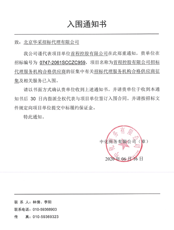 北京米兰注册(中国)招标代理有限公司成功入围首程控股有限公司招标代理机构
